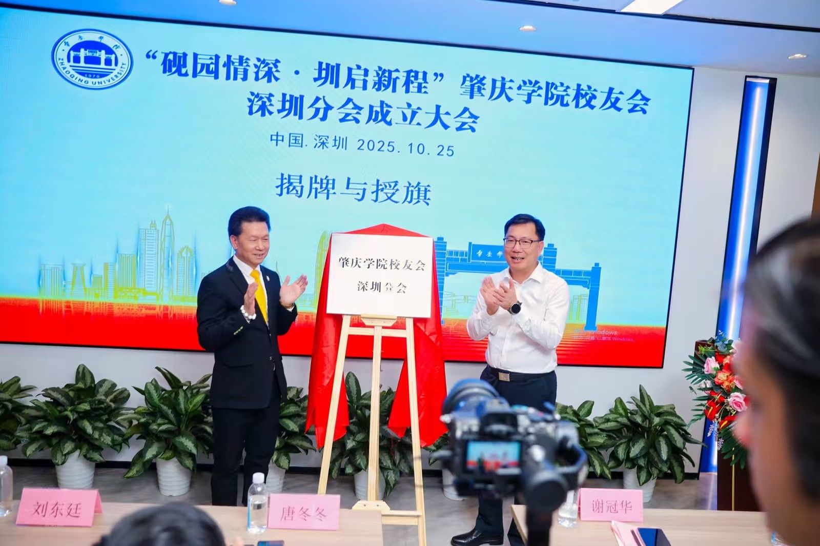 大会举行了庄重的揭牌与授旗仪式。学校党委书记谢冠华与理事会成员共同为“肇庆学院校友会深圳分会”揭牌,并为分会授旗。谢冠华在仪式后发表讲话,再次强调深圳分会是肇庆学院校友网络的重要组成部分,希望分会以成立为起点,团结带领在深校友,传承“厚德、明智、博学、力行”的校训精神,将分会建设成为校友的“温暖港湾”、母校的“深圳窗口”、湾区的“合作桥梁”。