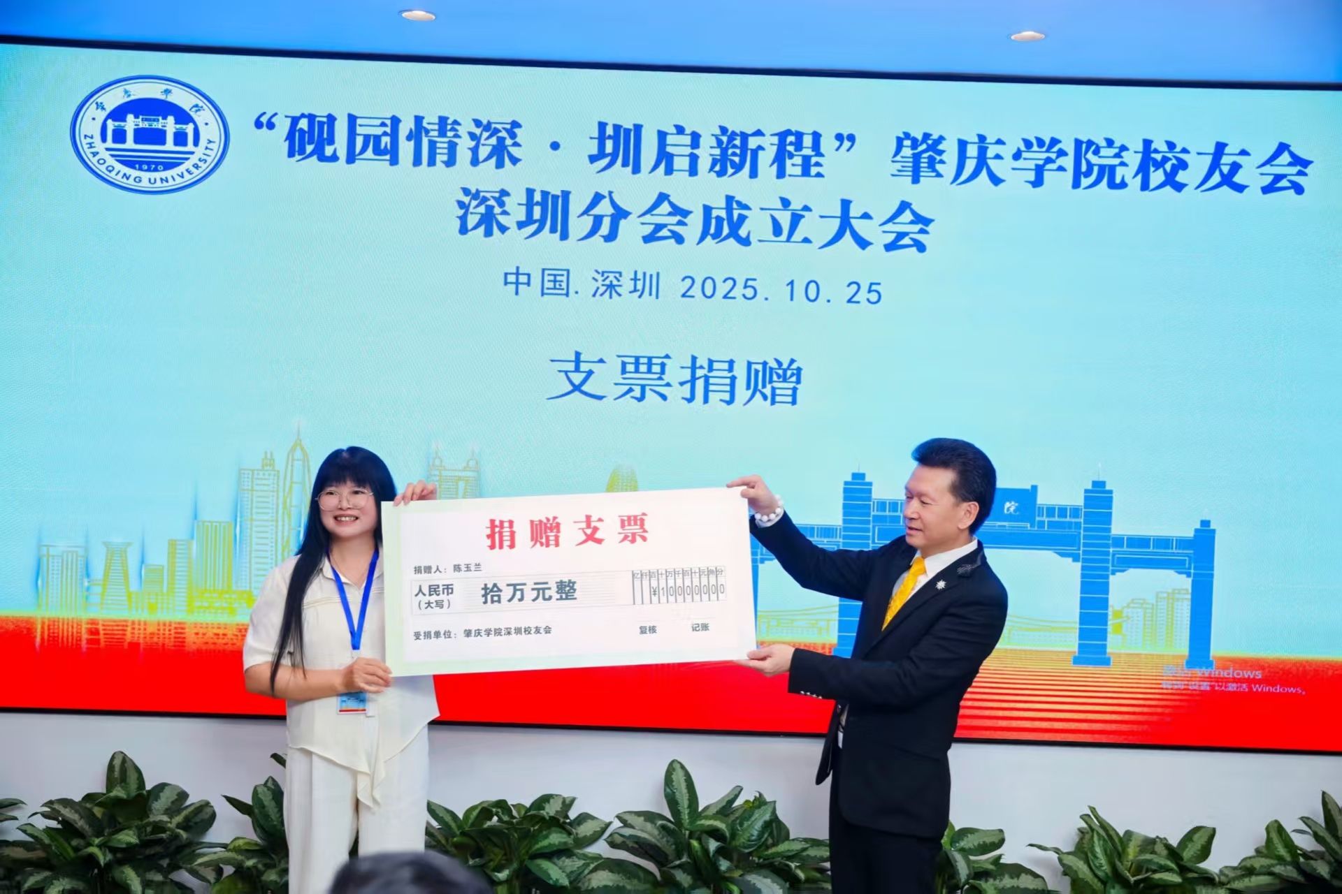 大会尾声,华希国际教育董事长陈玉兰女士(常务会长)为深圳校友会捐赠10万元,用于支持分会建设。值得一提的是,该笔捐款将与深圳校友会此前筹集的善款一并捐赠至学校基金会,作为母校55周年校庆的特别礼物。陈玉兰校友表示:“母校培养了我们,如今分会成立,我们希望能以实际行动回馈母校,为校庆添一份心意,也为校友与母校的情谊续写新篇。”这一暖心举动赢得全场热烈掌声,彰显了肇庆学院校友“饮水思源、反哺母校”的深厚情怀。