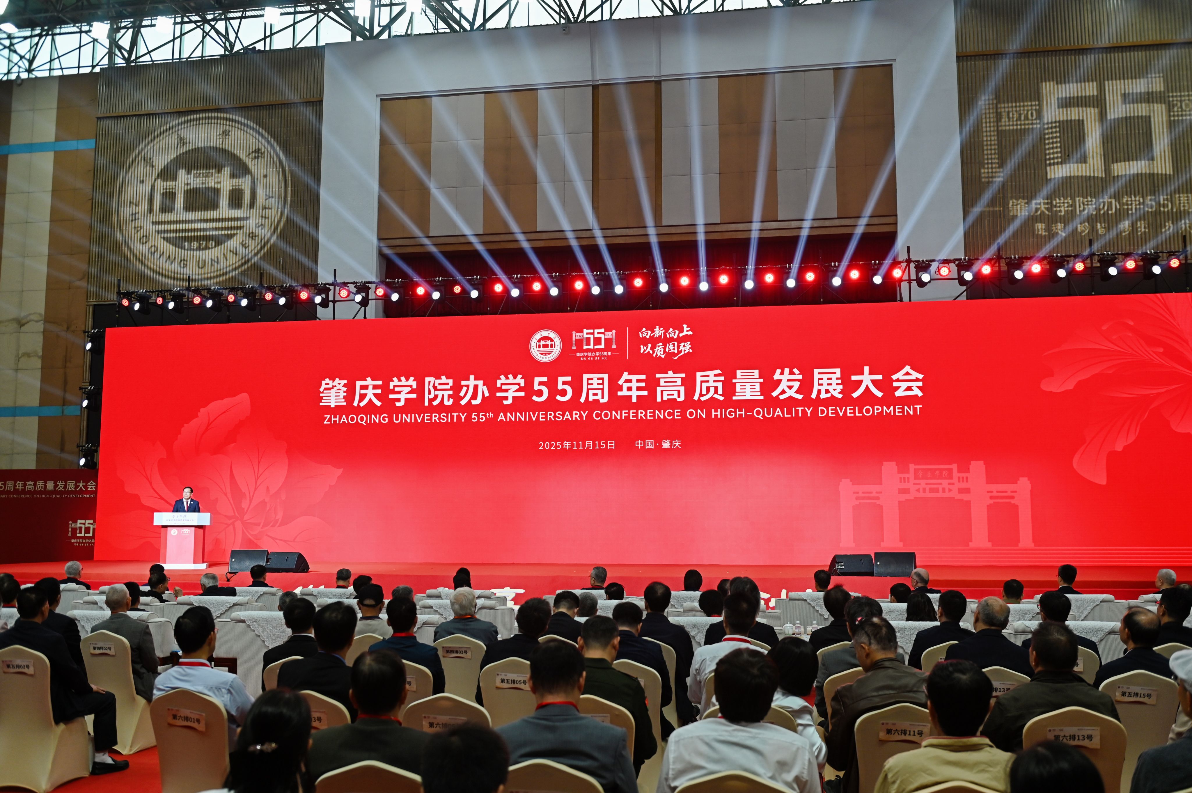 金风送爽,翰墨留香,五十五载春秋荣光。11月15日,学校以"向新向上,以质图强"为主题,在体育馆举行办学55周年高质量发展大会,回顾学校55年来办学历程,开启新征程高质量发展美好篇章。肇庆市委书记,市人大常委会主任张爱军,中国科学院院士、华南理工大学教授吴硕贤,中国音协管乐学会主席、中国人民解放军军乐团原团长、国家一级指挥于海,广东省文史馆馆员、著名书法家、书法理论家、诗人、作家孔见,肇庆市人民政府副市长邹莹,肇庆市政协副主席陈宣群,波兰密兹凯维奇大学副校长拉法尔·维特科夫斯基,波兰密兹凯维奇大学副校长米哈乌·巴纳沙克,马来西亚沙捞越大学副校长菲特里·苏拉亚,泰国格乐大学副校长罗勇,澳门圣若瑟大学副校长農韵淇等受邀出席本次大会。此外,来自省、市有关区、县,国(境)外合作高校、省内外兄弟院校、合作企业的代表,中专职校、中小学的校长与教师代表,海内外校友及校友会负责人,社会各界来宾、新闻媒体,以及学校老领导、现任领导、离退休老同志和师生代表等两千余人莅临现场参会,近十万名观众通过线上直播平台观看并互动。校党委书记谢冠华主持高质量发展大会,校长李琴作主题报告。