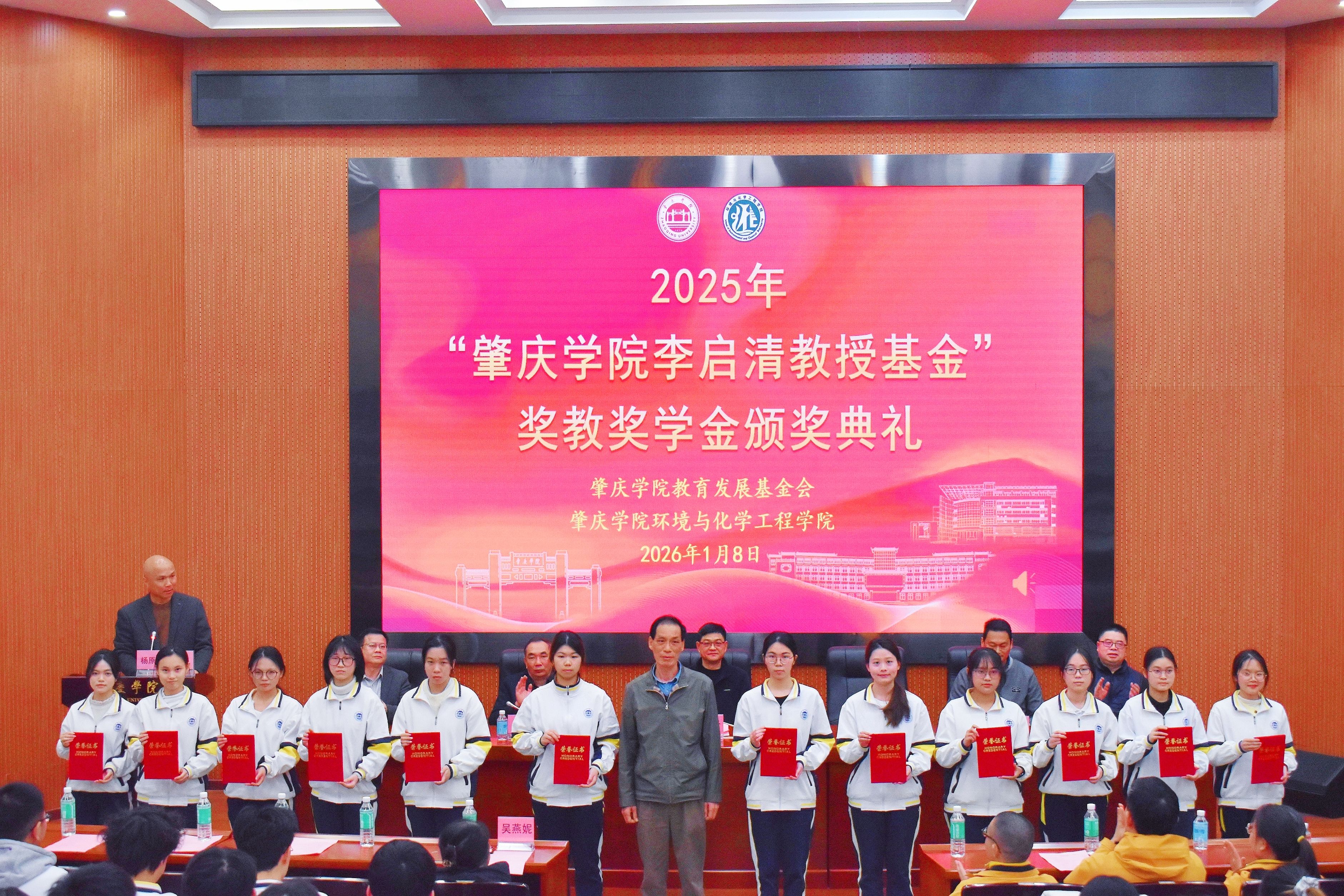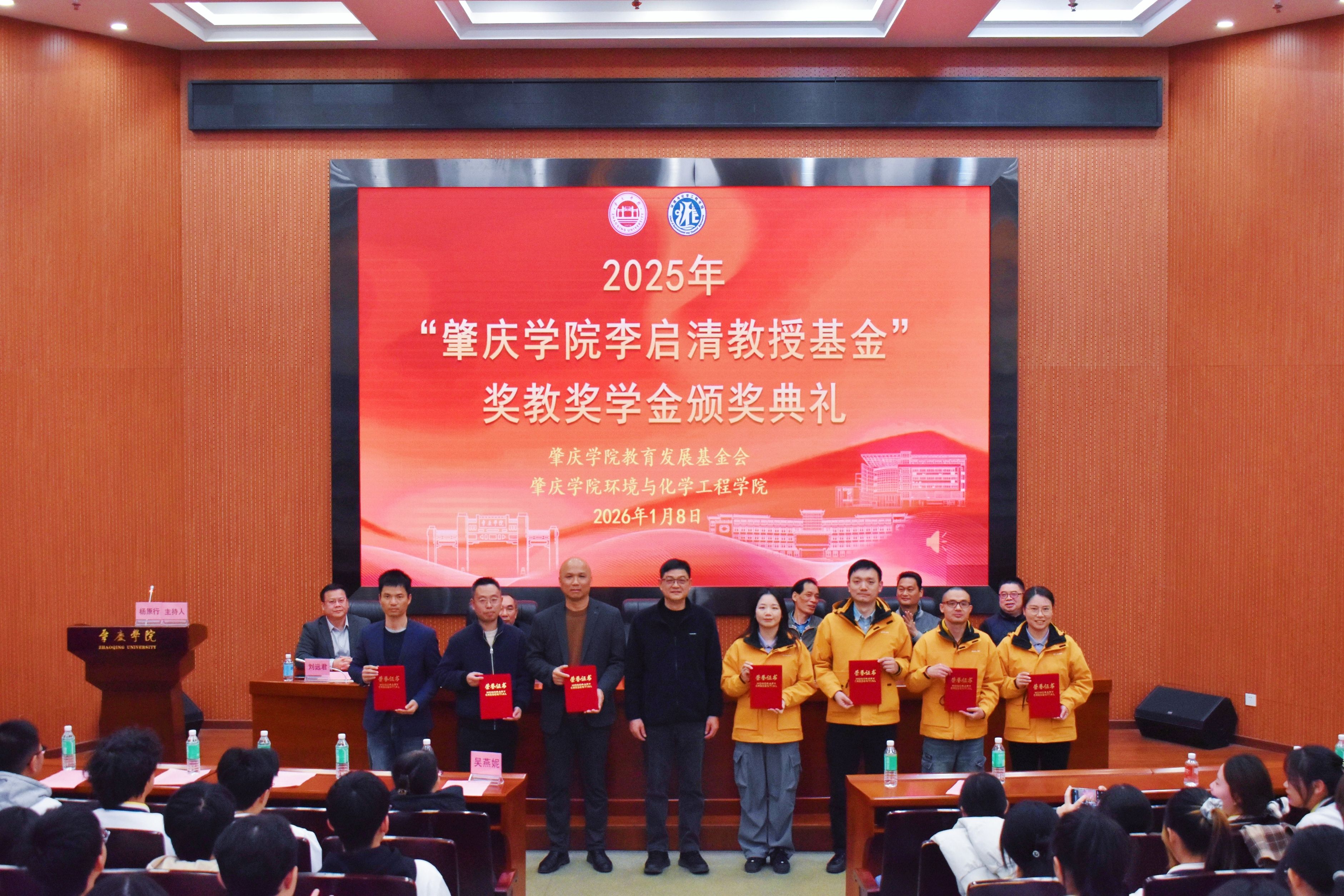2026年1月8日,肇庆学院“李启清教授基金”奖教奖学金颁奖典礼在福慧图书馆学术报告厅隆重举行。副校长唐冬冬,优秀校友代表、肇庆市海关原副关长魏国彬,优秀校友代表、肇庆市新联国有资产管理有限公司原经理吴国雄,校友会与教育发展基金会秘书长周建文,环化学院党委书记刘远君、院长李湘等领导嘉宾出席典礼,近380名师生代表齐聚一堂,共同见证这一荣耀时刻。典礼由环化学院党委副书记杨原行主持。